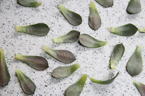 Once I removed the spaced out leaves I was left with a very long stalk with a little rosette at the end. I cut off this rosette leaving about an inch of stalk attached, and placed this with the leaves, making sure to keep the cut end of the stalk facing away from the soil. This is to allow it to callous and harden properly.
