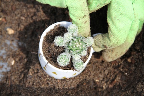 I put a small amount of gravel in the bottom of each cup for drainage, then popped in my cacti (without the plastic pot) then filled around it with a mix of compost and sand. wear gloves whilst repotting cacti kids, those things are vicious.